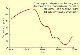 magnetic declination has changed with time at Halifax. Because of secular variation, declination values shown on old