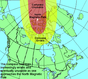 in strength as one approaches the North Magnetic Pole, where it is zero. Close to the pole, an area is reached where the