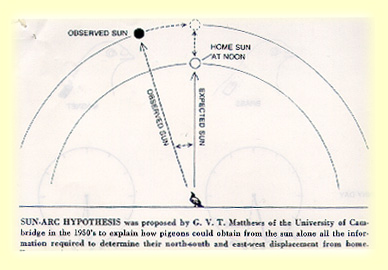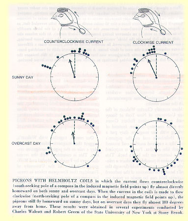 The following is a copy of articles published by Cornell University.PIGEON NAVIGATIONThe ability of homing pigeons to navigate back to their "home" loft from distant and unfamiliar release sites has provided an excellent means by which to investigate the importance of various external cues in spatial navigation. When reared in a particular loft, a young pigeon can be transported hundreds of miles away and successfully find its way home from the release site. Because it requires the pigeon to pinpoint a specific location, this behavior necessitates more than the compass orientation system of migratory birds. Instead, the pigeon must be able to determine its position relative to the location of the home loft in order to orient itself in the proper direction. In doing so, pigeons use a variety of external cues such as the sun, visual landmarks, olfactory cues, and the earth's magnetic field. Depending on the weather conditions, where the pigeon was raised, and the nature of the release site, pigeons use a combination of these cues to determine their flight path. Examining when and how different cues are utilized by homing pigeons has provided neuroethologists with a better understanding of avian spatial navigation. HOMING BEHAVIORIntrinsically, pigeon homing behavior is well suited to neuroethological study. Because the natural environment of the homer is a domestic one, it is easier to observe and manipulate pigeons in their normal surroundings without drastically affecting their natural behavior and setting. As a result, homing pigeons have become a favorite subject for the study of avian spatial navigation. Many ingenious methods for investigating the use and salience of various external cues in pigeon homing have been developed. From these experiments, we have gained no definitive explanation for the ability of homers to navigate back to their home loft, but rather we have learned that the mechanism underlying this behavior is extremely complex. Many experiments have yielded different and often contradictory results which make it difficult to develop a universal understanding of the homing mechanism. It is clear, however, that pigeons are able to utilize several sources of environmental information in order to home efficiently under variable conditions. Of these cues, the most well studied are the pigeon's use of the sun, environmental odors, the magnetic field and visual landmarks. Gould (1982) describes the behavior of a homing pigeon as it is released from a site distant from its home loft. Initially, the pigeon circles around the release site several times. It then orients itself in a particular direction and flies in a relatively strait path away from the release site. The original bearing in which the pigeon flies is usually quite close to the actual direction of the home loft. Although the approximate direction is maintained during flight, the homeward journey of the pigeon varies. A pigeon, even when it is released from the same site on numerous occasions, does not fly an identical route each trip. The original flight direction is often referred to as the vanishing bearing or bearing at which the bird disappears from visual or radio contact. Because it is a reliable measure of the overall flight direction, the vanishing bearing is often used in the experimental literature to represent the homeward orientation. When many birds are released at a particular site, the mean vanishing bearing can be calculated by averaging the vanishing bearings of the individual pigeons. Interestingly, the mean vanishing bearing at a particular site often deviates slightly from the actual homeward direction. At each site, this deviation, known as release site bias, is reproducible and always occurs in the same direction (i.e. left or right) of the home loft bearing. In many instances, a mean vector length is calculated. The direction of the vector corresponds to the mean vanishing bearing and its length indicates the significance of the directional measure. If most pigeons are oriented in roughly the same direction, the mean vector length will be longer than when the vanishing bearings of the pigeons are highly variable. Most pigeon homing experiments manipulate the pigeons' ability to utilize one or more external cues and subsequently release the birds at a site distant from the home loft. Using the measures described above as well as others, experimenters can determine the effect, if any, of the experimental manipulations on homing behavior. Gould (1982) describes three theories that have been proposed to explain the navigational abilities of homing pigeons. Firstly, it may be that pigeons, like ants and honey bees, are able to track their outward journey so that they can later retrace their path home. Secondly, pigeons could home based on a cue gradient system which is centered at the home loft. Such a system, however, would not require a compass mechanism. Lastly, the pigeon may home via a true map sense. This would enable the pigeon to determine its location directly through site specific cues which would describe its position in relation to the home loft. Because pigeons deprived of outward journey information are able to home well, the first hypothesis has been largely disproved (Wallraff, 1980). Furthermore, pigeons have been shown to possess an internal compass mechanism which they use for spatial navigation (Kramer, 1950). It appears, then, that the last theory is most likely the correct one in the context of pigeon homing. In fact, the theory of true navigation in pigeons has been almost unanimously supported by the experimental literature. This type of navigation is often described as using a map and compass. Kramer (1953) proposed this two-step mechanism based on the theory that in order to find its way home, the pigeon must first be able to extrapolate its map position. From this determined map position, the pigeon can then orient itself in the home direction via some sort of compass me